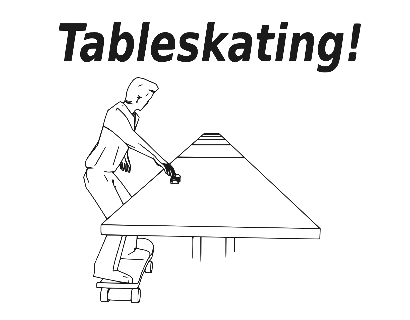 Tableskating or "Table Skateboarding" if you prefer, is quite literally the ultimate board game that has nothing to do with sitting around a table, rolling dice, flipping cards, or worst of all having to wait enormous amounts of time for something interesting to happen. It requires intermediate balance, extreme hand-eye coordination and impeccable timing.